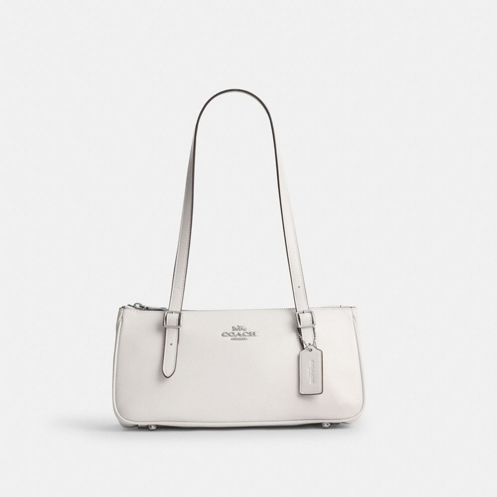 COACH®,Asher Shoulder Bag,Leather,Shoulder Bag,Metal,Logo,Lined,Luggage Tag,Adjustable,Compact,Key Ring,Silver Metal,Casual,White,Front View