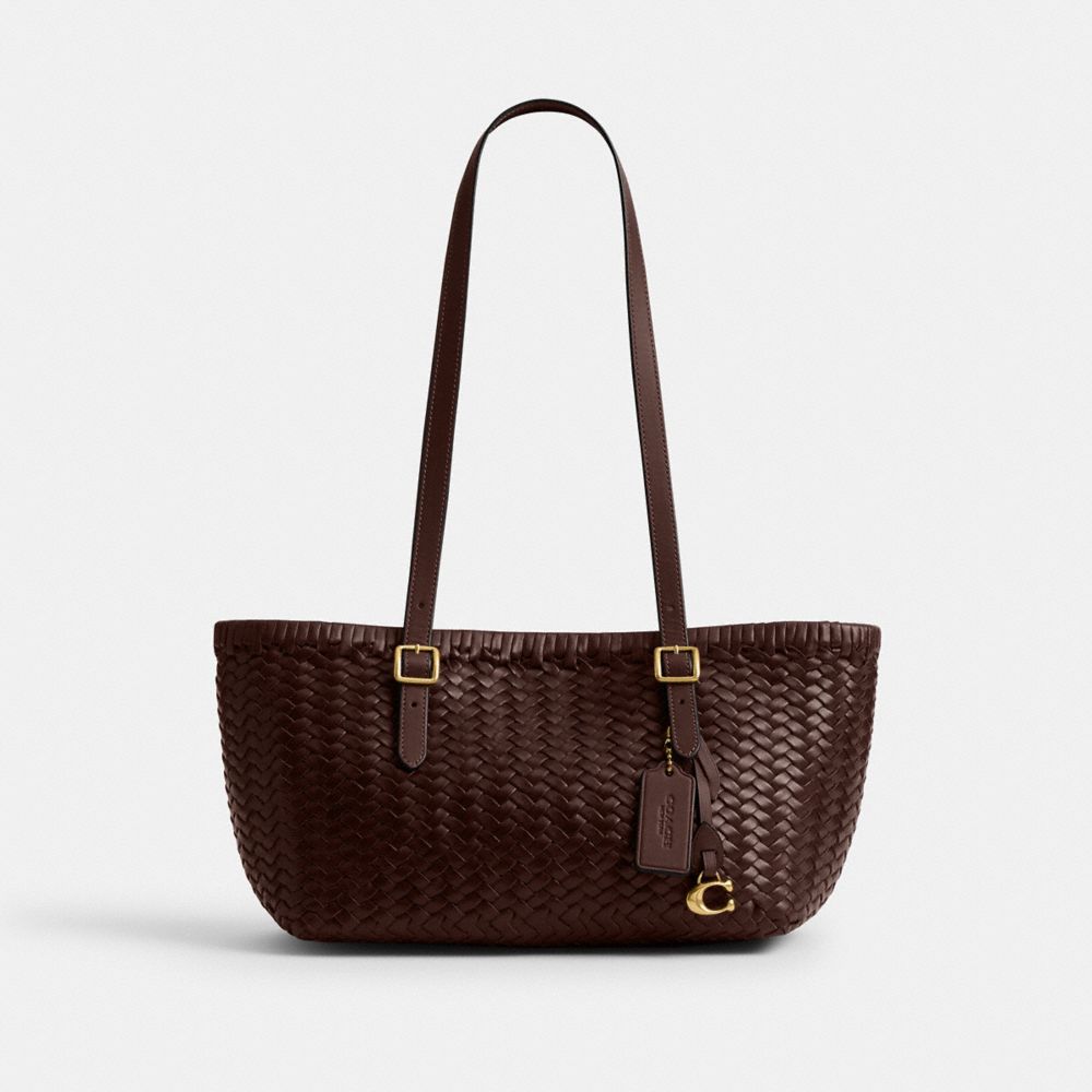 COACH®,Woven Swing Tote Bag,Leather,Tote,Logo,Metal,Adjustable,Lined,Gold Metal,Day Party,Brown,Front View