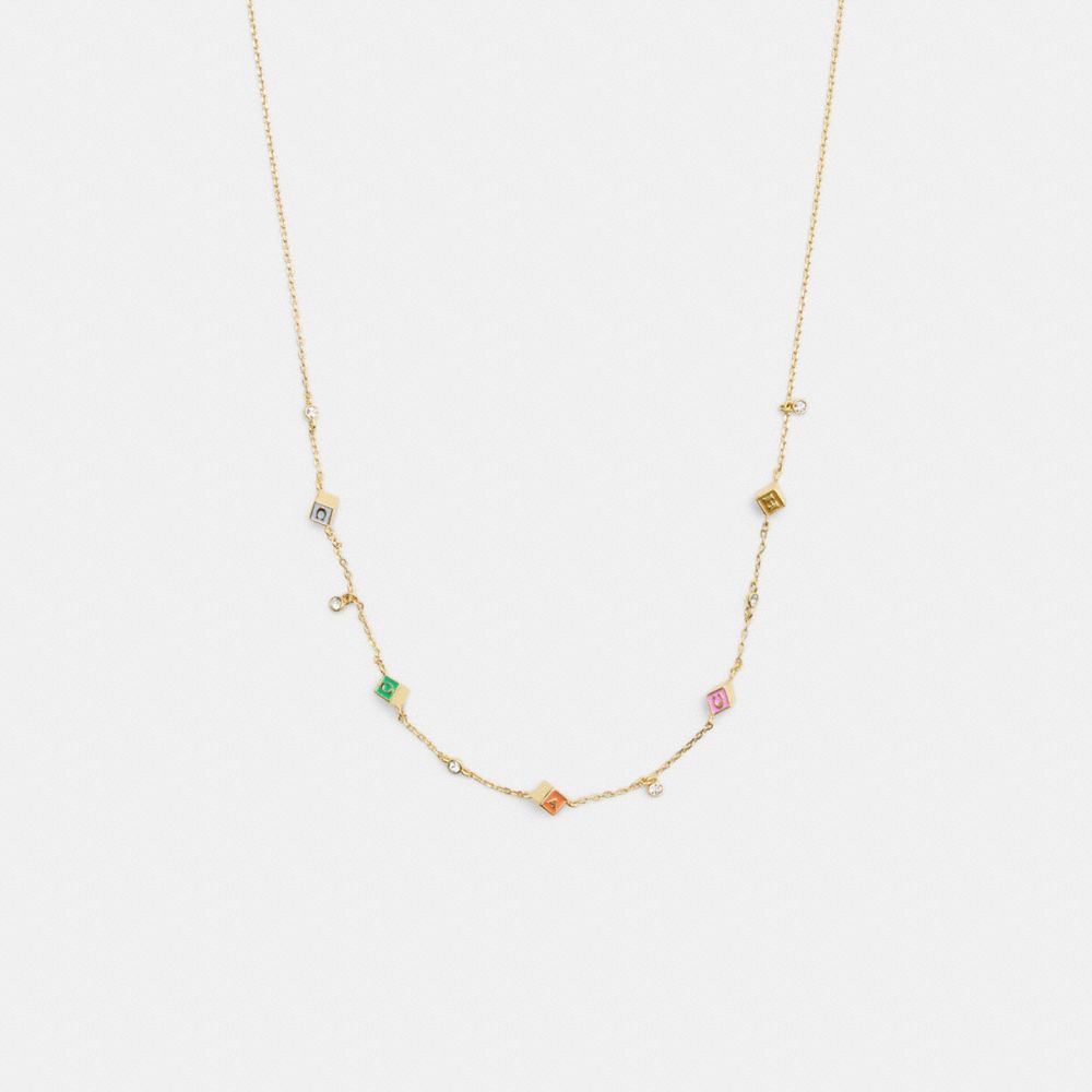 A throwback to childhood favorites, this chain necklace features shimmering crystals and colorful block letters that spell out our name. The playful style is finished with an adjustable clasp to wear long or short.