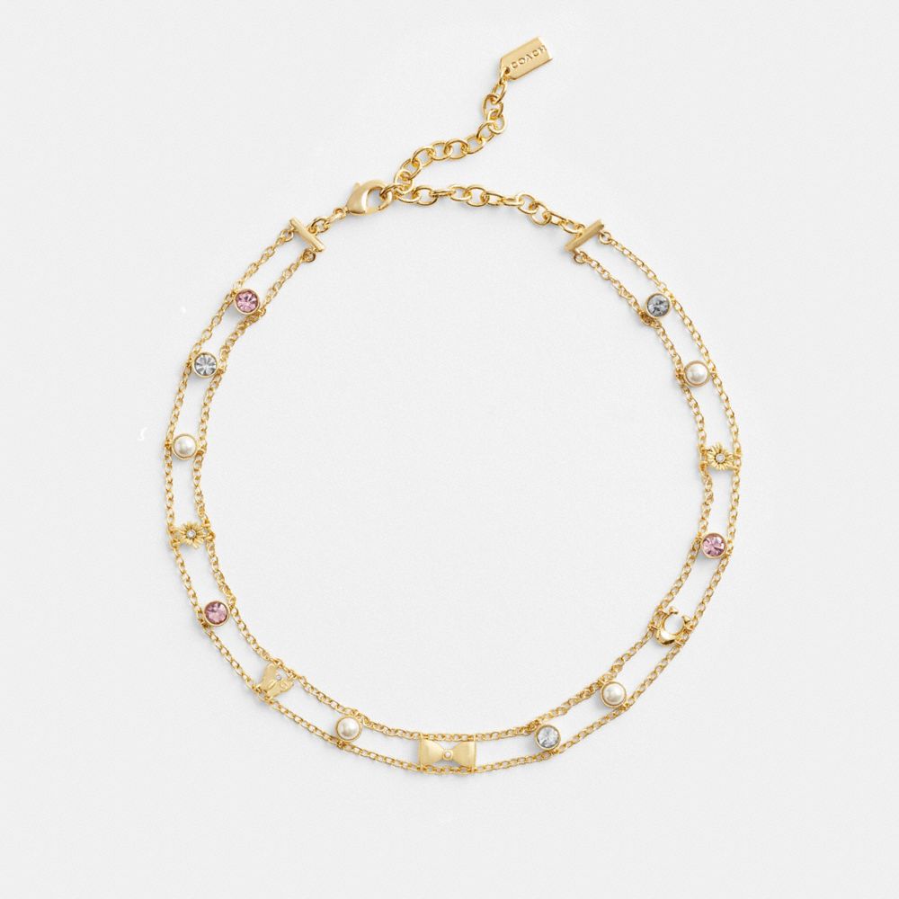 Stop and smell the flowers. Part of our garden-fresh collection, this delicate chain choker features an array of enchanting nature motifs. Complete with pops of color, sparkle and glass pearls, the necklace is finished with an adjustable clasp closure to ensure a comfortable fit.