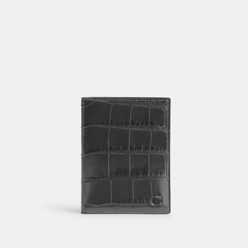 COACH®,Passport Case,Calfskin Leather,Bi Fold,Passport Case,Passcase Wallet,Logo,Travel,Black,Front View