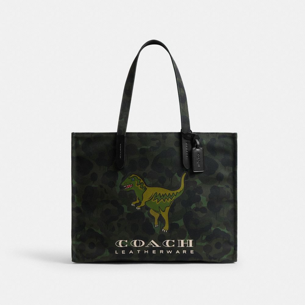 COACH®,Tote With Camo Print And Rexy,Canvas,Tote,Metal Material,Graphic,Word Embellishment,Embellished,Metal,Lined,Durable...,Multi Color,Front View
