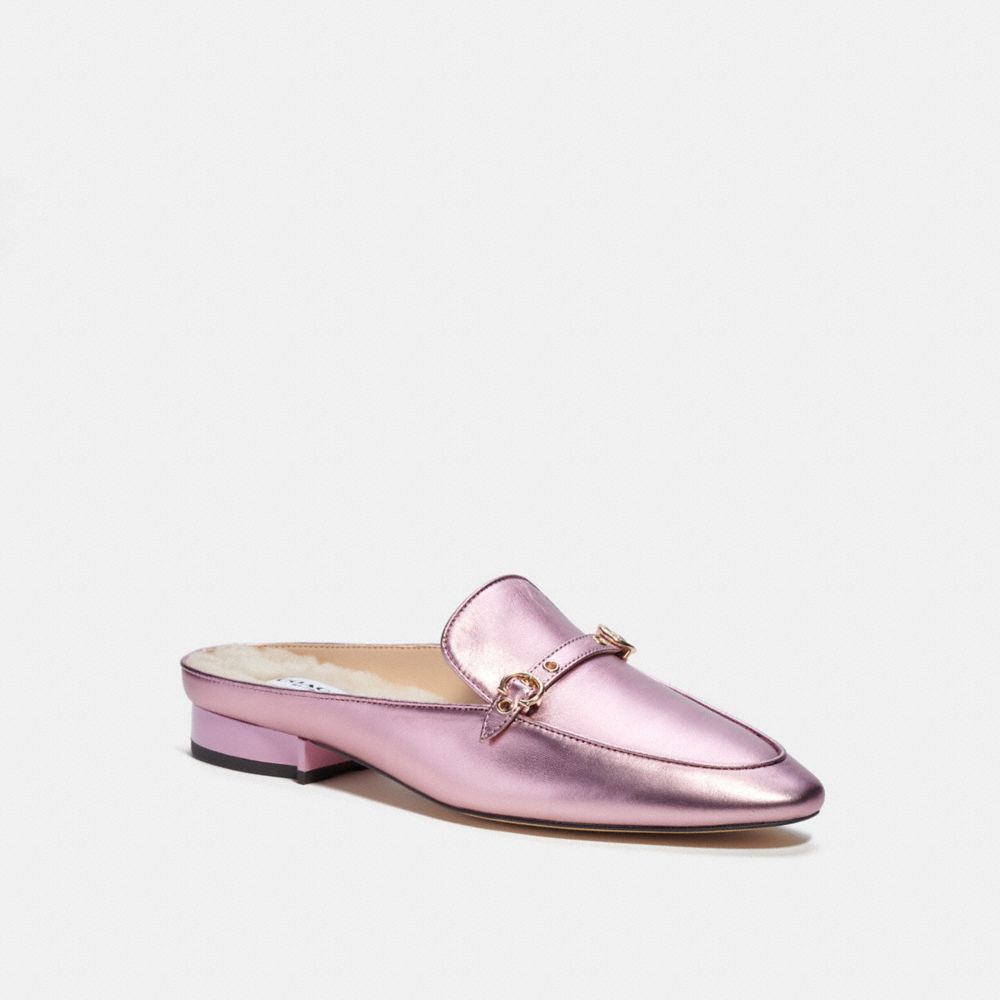 A relaxed easy-to-wear style, this high-shine metallic leather loafer-slide mashup is detailed with our Signature buckle for an iconic Coach look. Featuring a sophisticated pointed toe and elongated vamp, it’s finished with a non-skid rubber sole for great traction and breathable, cushiony memory foam padding for all-day comfort.