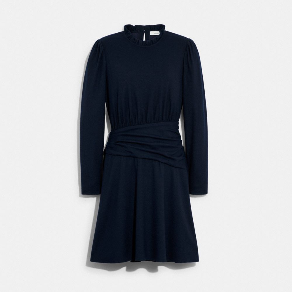 Keep this fit-and-flare jersey dress easily within reach, the lightweight ruffled-neck design is perfect for day, night, work and weekends. It features gathered shoulders for a touch of volume and a shape-defining asymmetrical banded waistline.