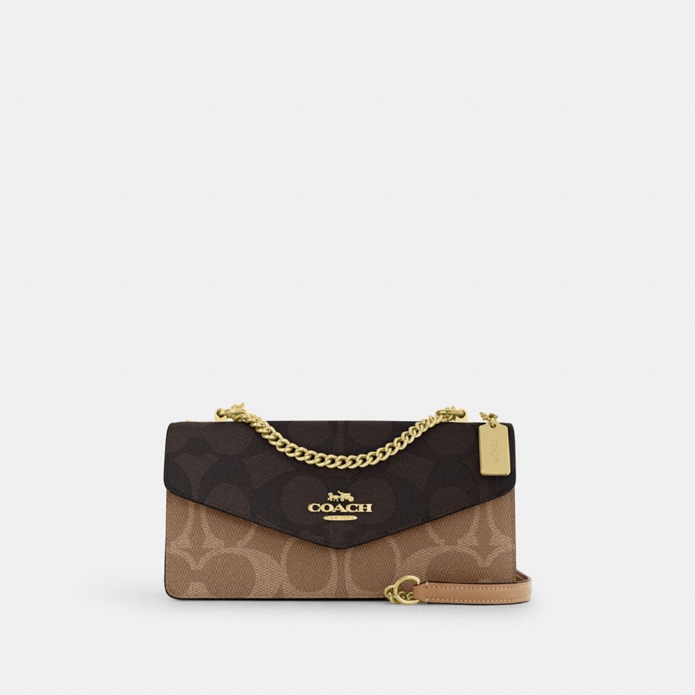 COACH®,Klare Envelope Crossbody Bag In Blocked Signature Canvas,Canvas,Leather,Crossbody,Word Embellishment,Metal,Logo,Gol...,Brown