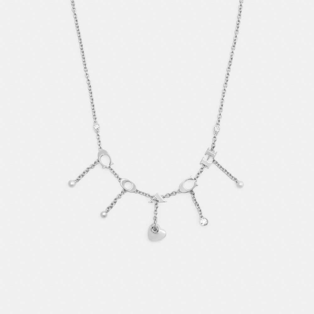 COACH®,Open Circle Heart Charm Necklace,Single Strand,Cubic Zirconia,Glass,Metal Material,Lettering Word,Logo,Gem Embellis...,Multi Color,Detail View