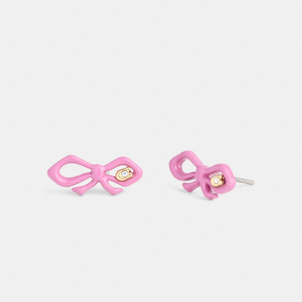 COACH®,Resin Mini Bow Stud Earrings,Studs,Glass,Resin,Cubic Zirconia,Gem Embellishment,Logo,Lettering Word,Initials Embell...,Pink,Front View