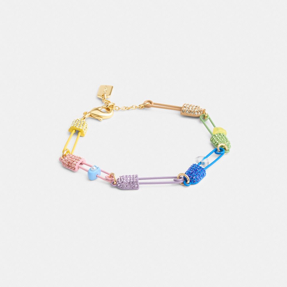 A utilitarian-chic style, this linked safety pin bracelet is amped up with bright crystals and a scattering of our signature motifs. The playful design is finished with an adjustable clasp closure to fit most wrists.