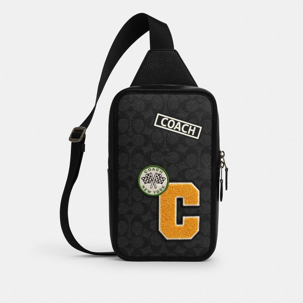 COACH®,Sullivan Pack In Signature Canvas With Patches,Canvas,Calfskin Leather,Slingback,Adjustable,Casual,Black,Front View